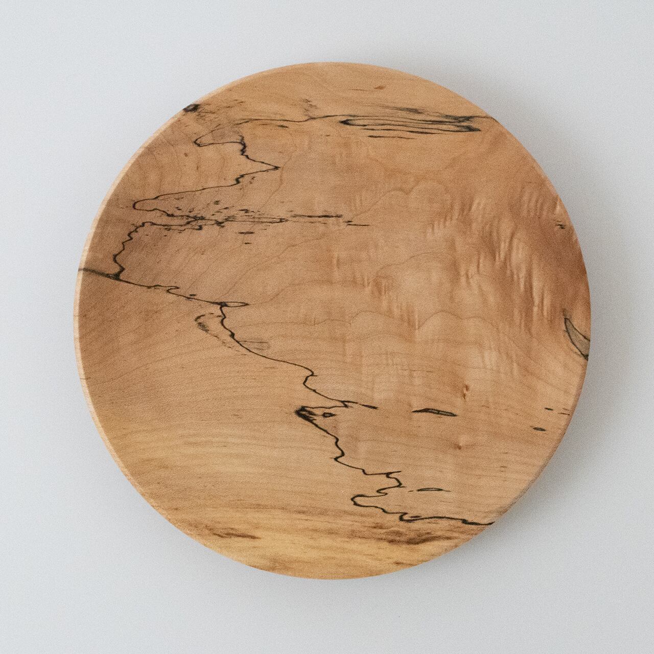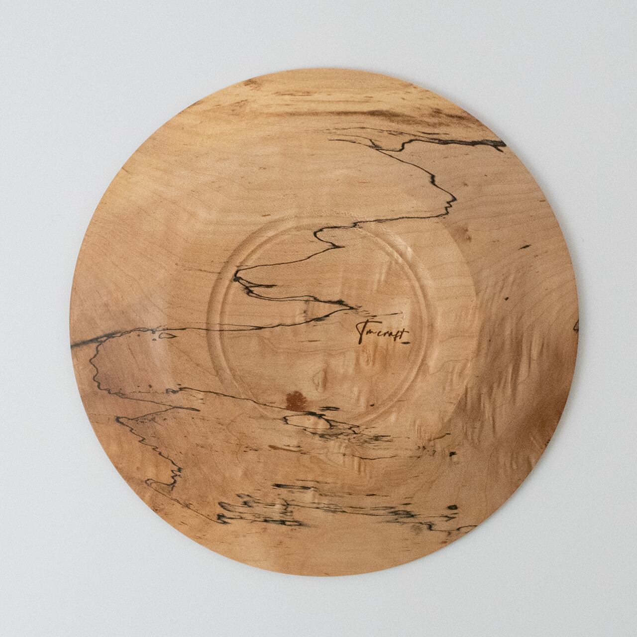 黒い筋のような模様はスポルテッドと呼ばれている杢(もく。珍しい木目)の一種。さらに、角度によって輝いて見える杢まで入った貴重な一枚。まるで森の奥に隠された秘密の絵画のような造形です。道管が細く目立たない散孔材のため、肌触りはシルキーで滑らか。眺めても触っても、心に温かな余韻が残ります。塗料はガラス塗料を使用していますので、メンテナンスも楽々。