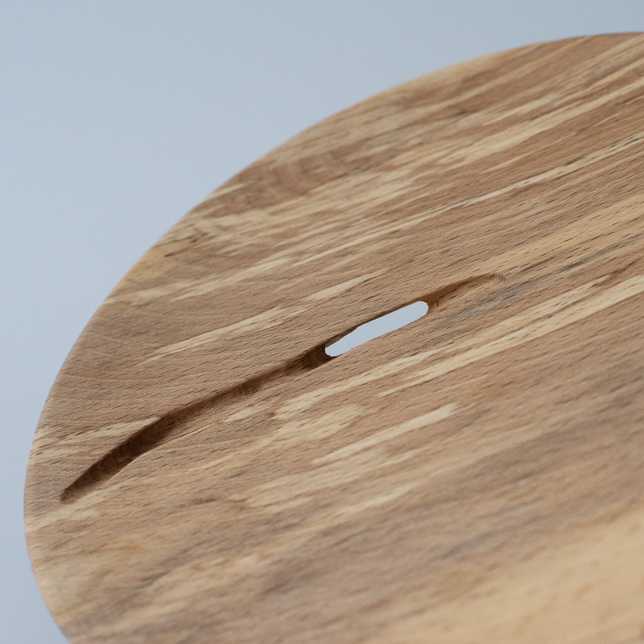 木目の色合いは風が過ぎ去ったような疾走感を感じさせます。そして最大の特徴はお皿に走る特徴的な溝。整然とした美しさに思いがけない混沌が滑り込んで、生のリズムが刻まれています。貫通する穴は欠点かと思いきや、パンくずを排出するのにうってつけ。