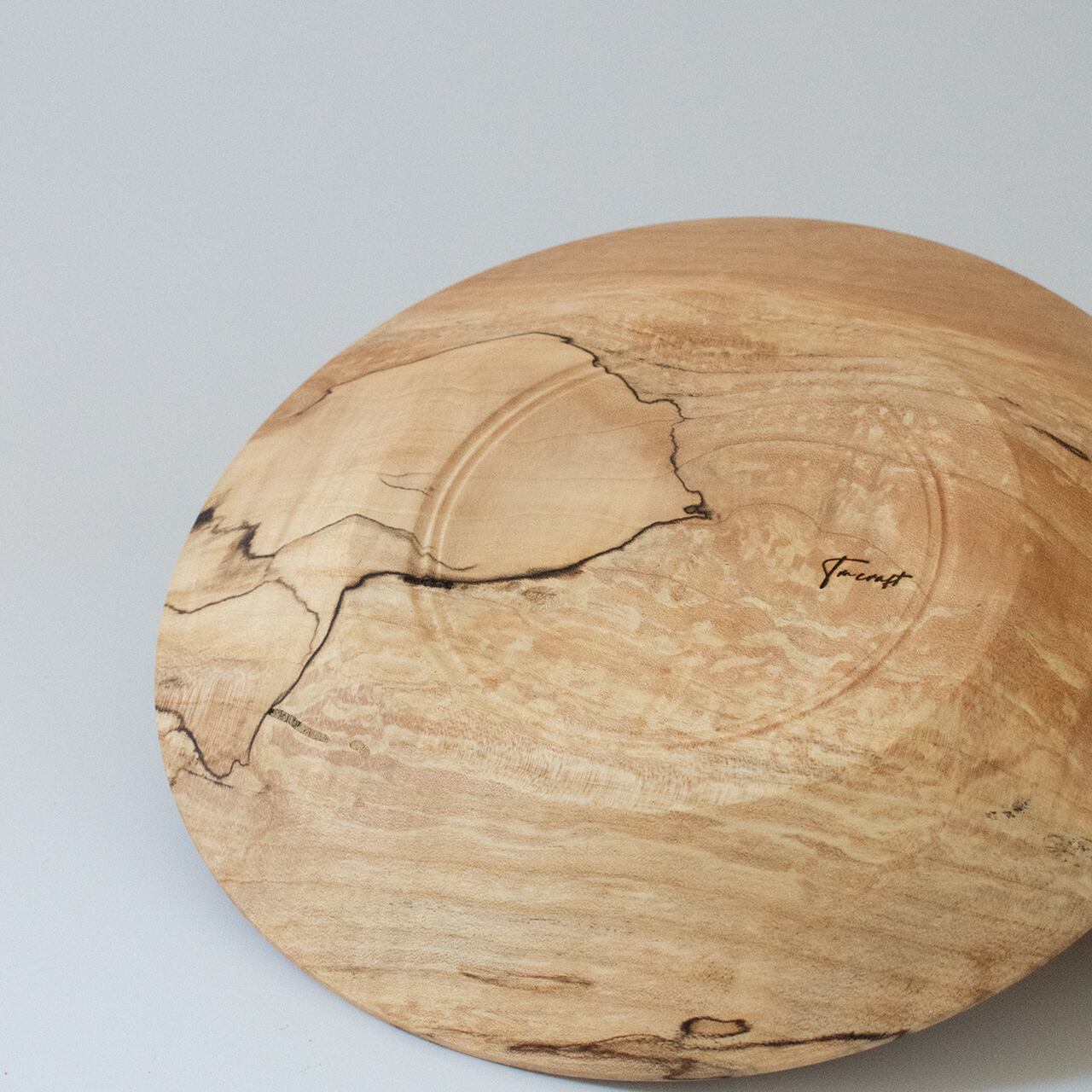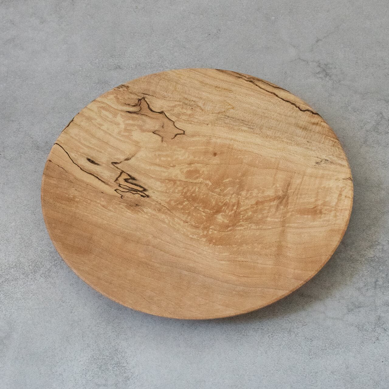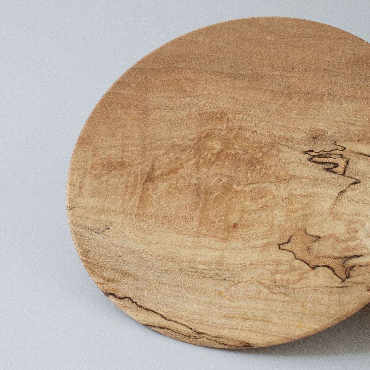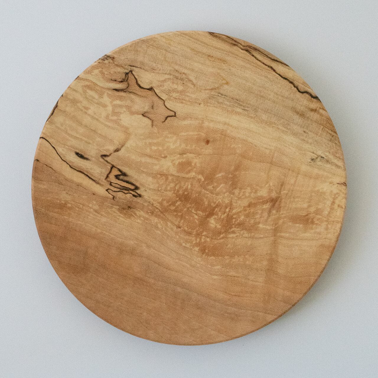 お皿の中央でゆるやかに湾曲しながら別れていく木目と、それにかかる煌びやかな杢(珍しい木目)がとても神秘的。黒い線のようなスポルテッドは表情を深めるのに一役買っています。眺めてよし、使って良しの万能な一枚。