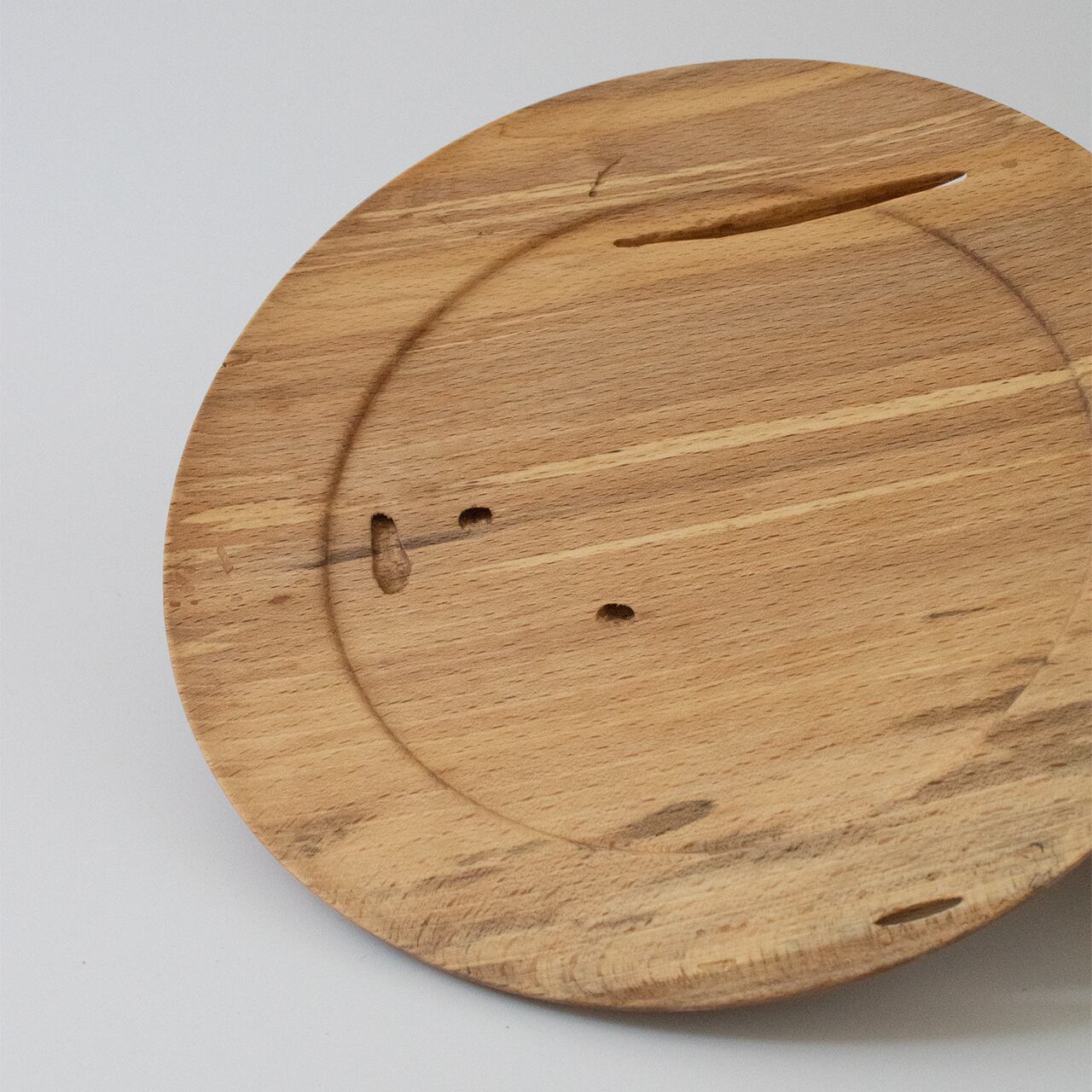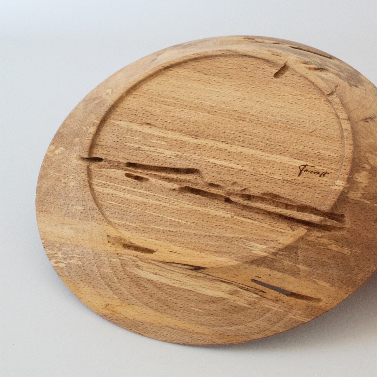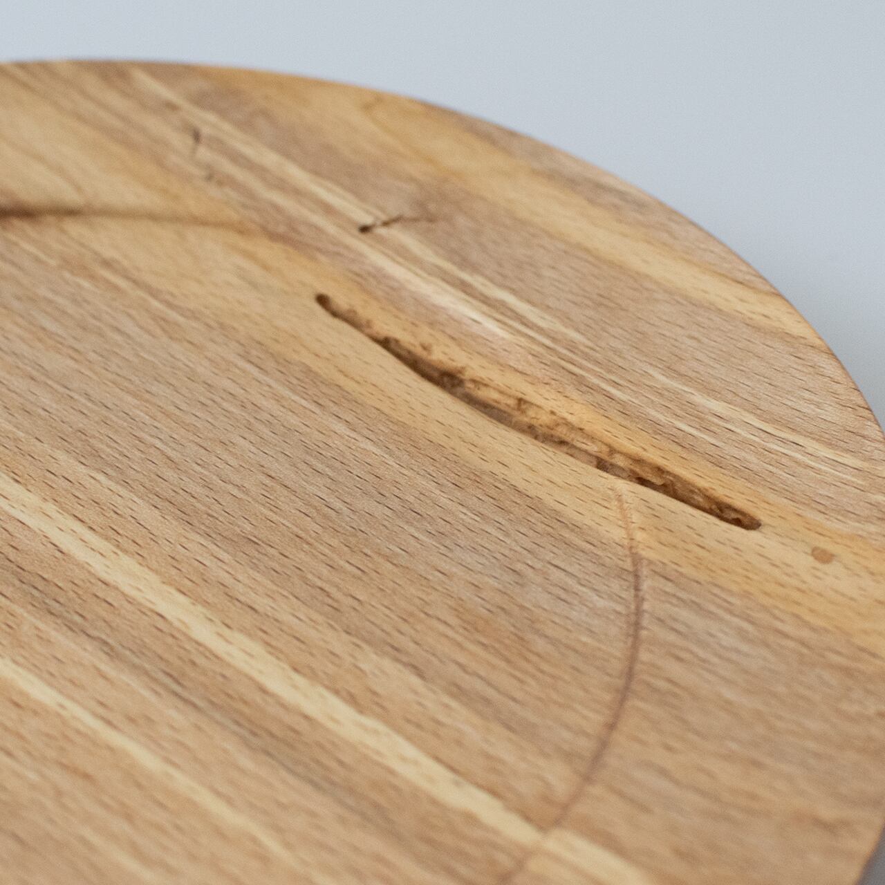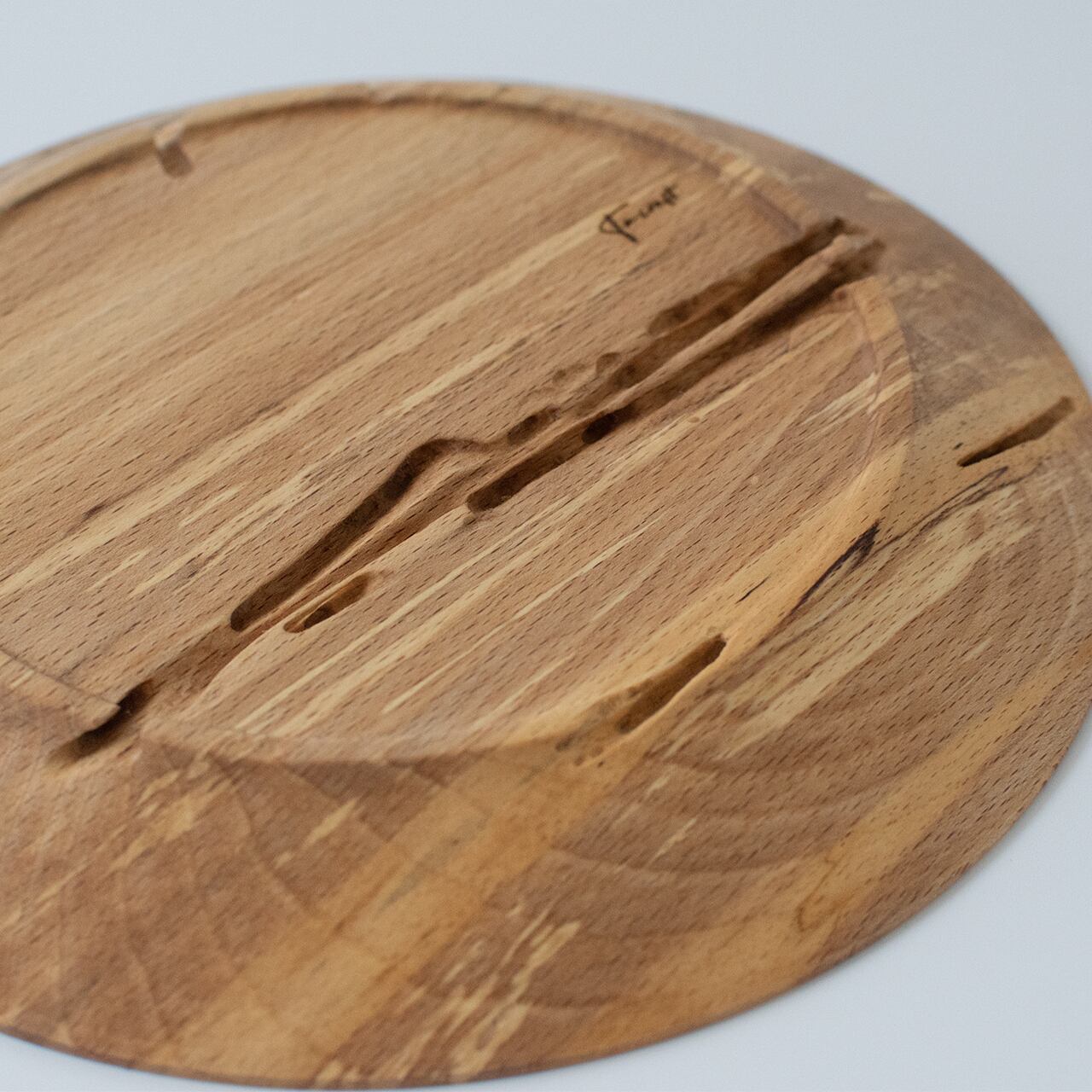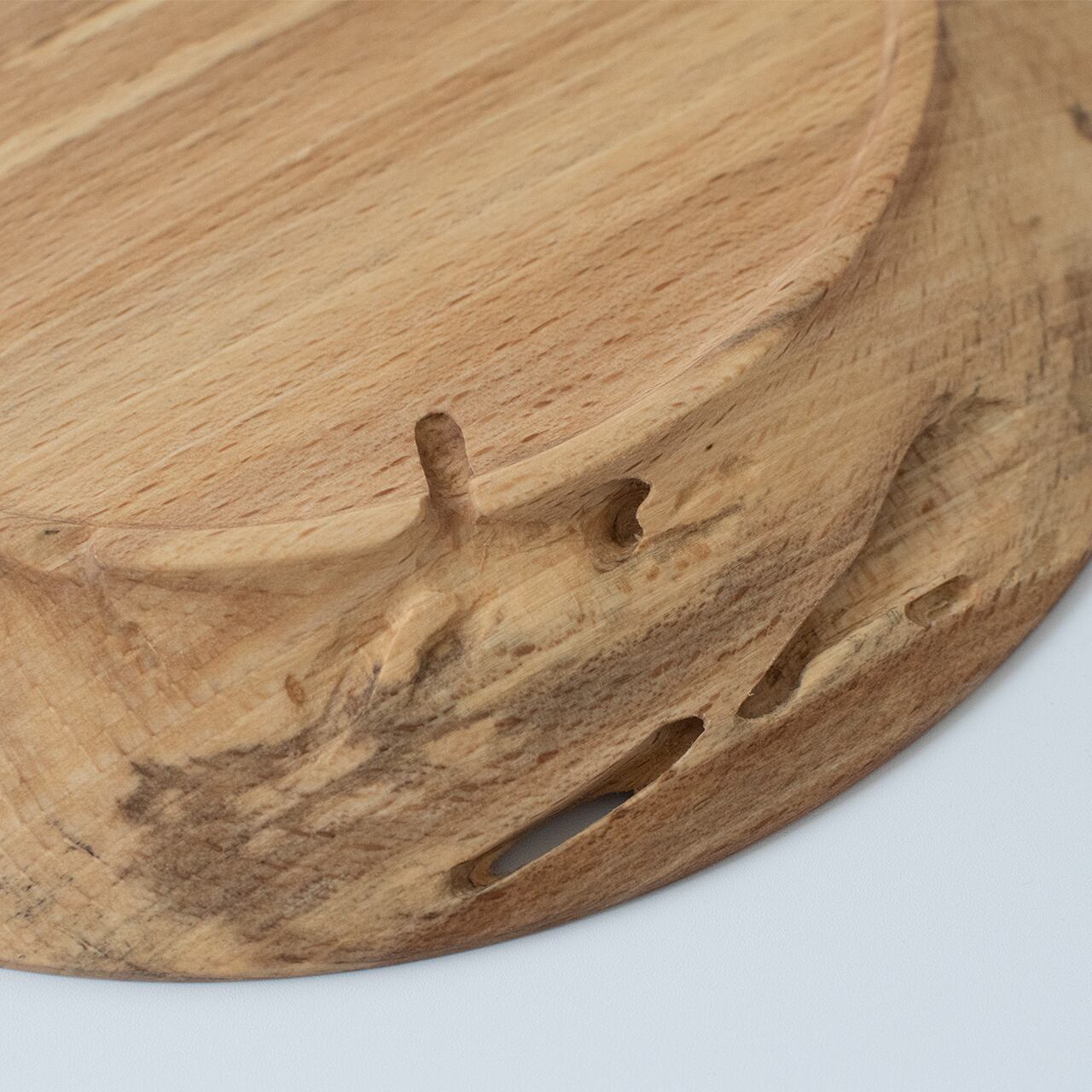 ブナ特有の明るい色合いに疾走感ある木目。しかしその中に何かが通り過ぎた痕跡。木の中をすり抜け、形となって浮かび上がった軌跡です。それが顕著に現れているのがお皿の裏側。内側から描いた地図のように溝が刻まれ、なんとも言えない深みを生み出しています。