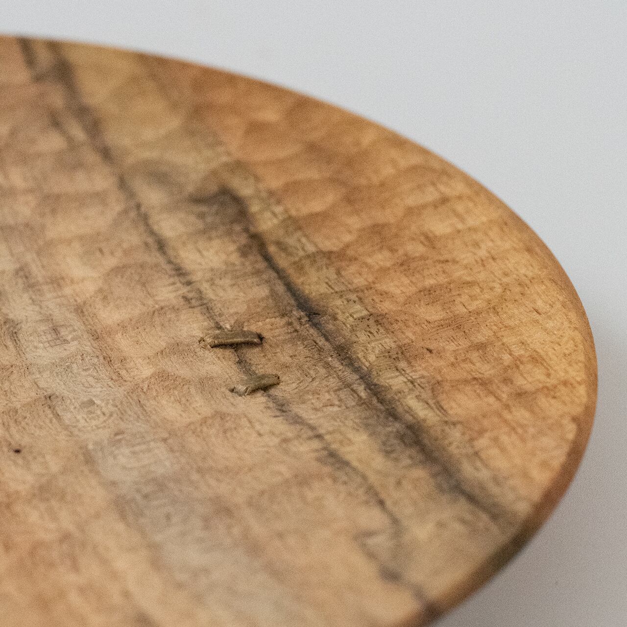 黄褐の穏やかな濃淡が滲むように広がる木目。淡く描かれたスポルテッドの黒。まるで古い写真に光を当てたような美しさです。希少なスローネア材だからこそ宿る、静謐で奥深い存在感は秀逸。ランダムについた手彫りの模様と、2つの鎹が最高のアクセント。