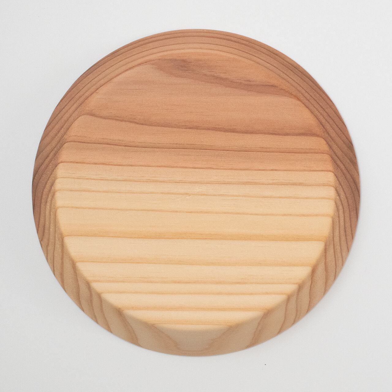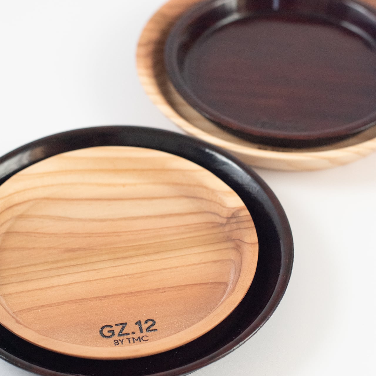 明るい表情を楽しめるのがこのナチュラルカラー。年輪のやわらかな陰影と、素肌のぬくもりが、手に取るたびに森の息づかいを思い出させてくれます。直径は約15㎝。コンパクトなメインのお皿としても重宝する1枚です。GZ.12を重ねてもほとんど段差なく持ち運べます。