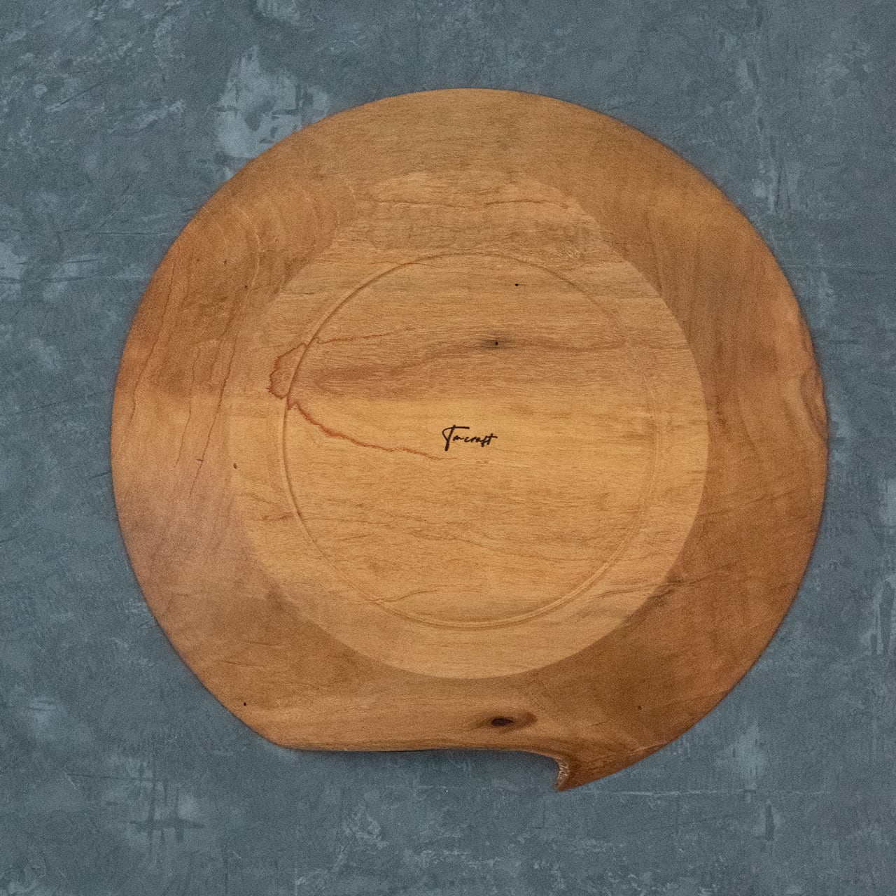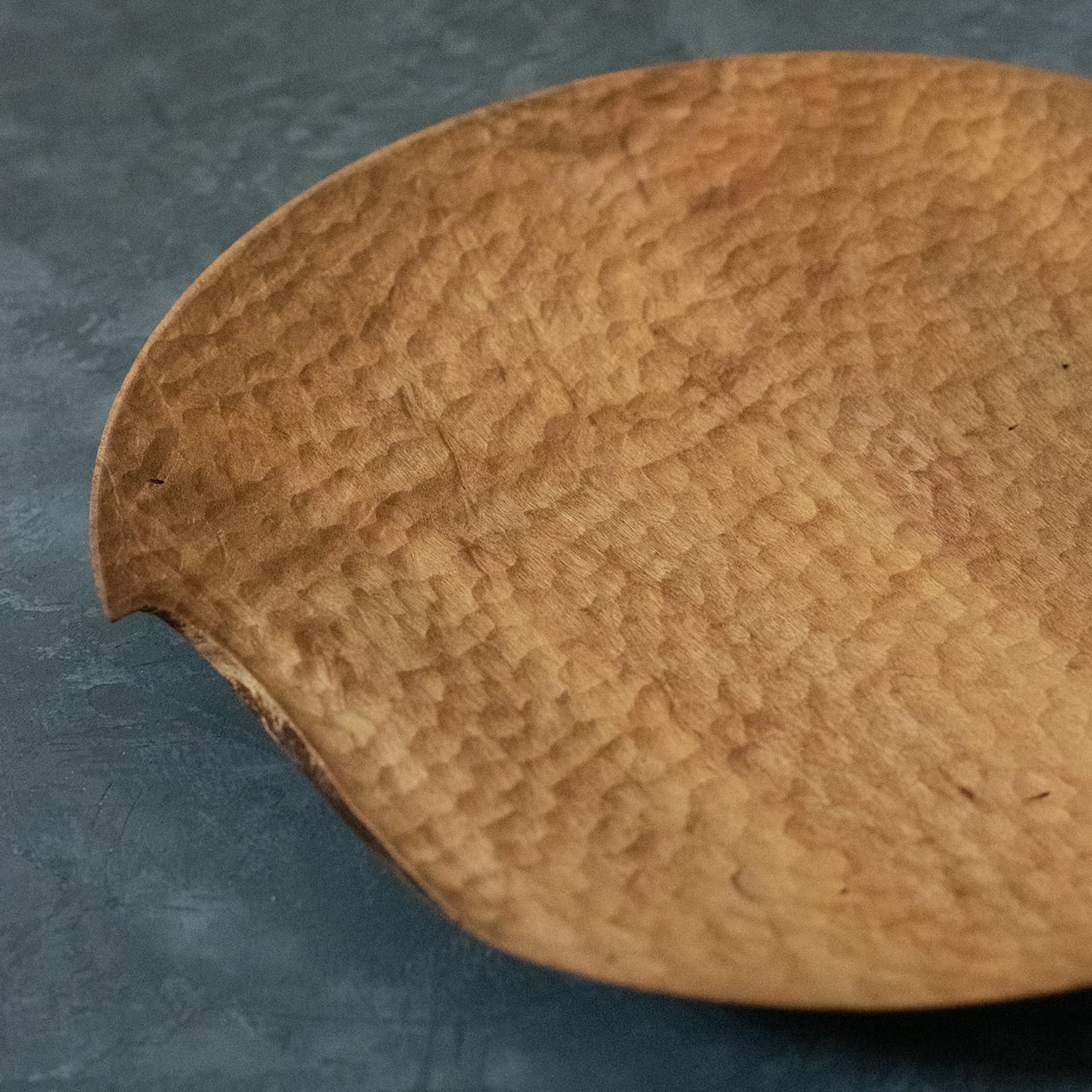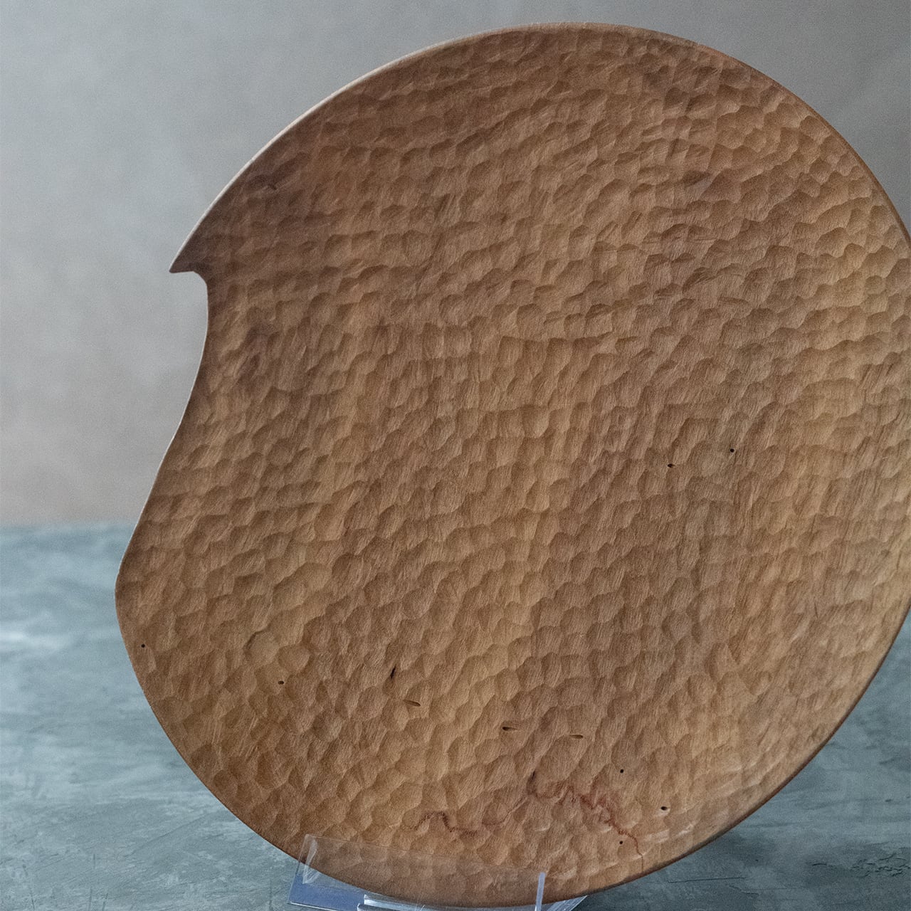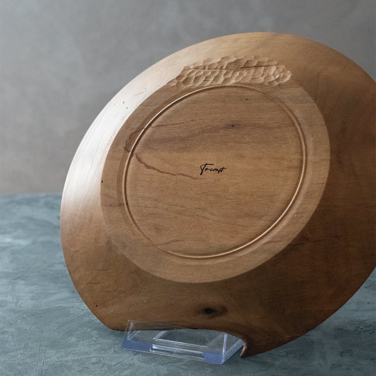 元々欠けてしまっていた材をそのまま生かしました。大きく欠けたフチはこのお皿が持つ最大の特徴です。おおよそ6mmの無数の彫模様・・・とっても時間がかかりましたが、繊細さと大胆さを兼ね備えた比類なき1枚に。裏側の元々割れてしまったところも手彫りで模様を付けています。