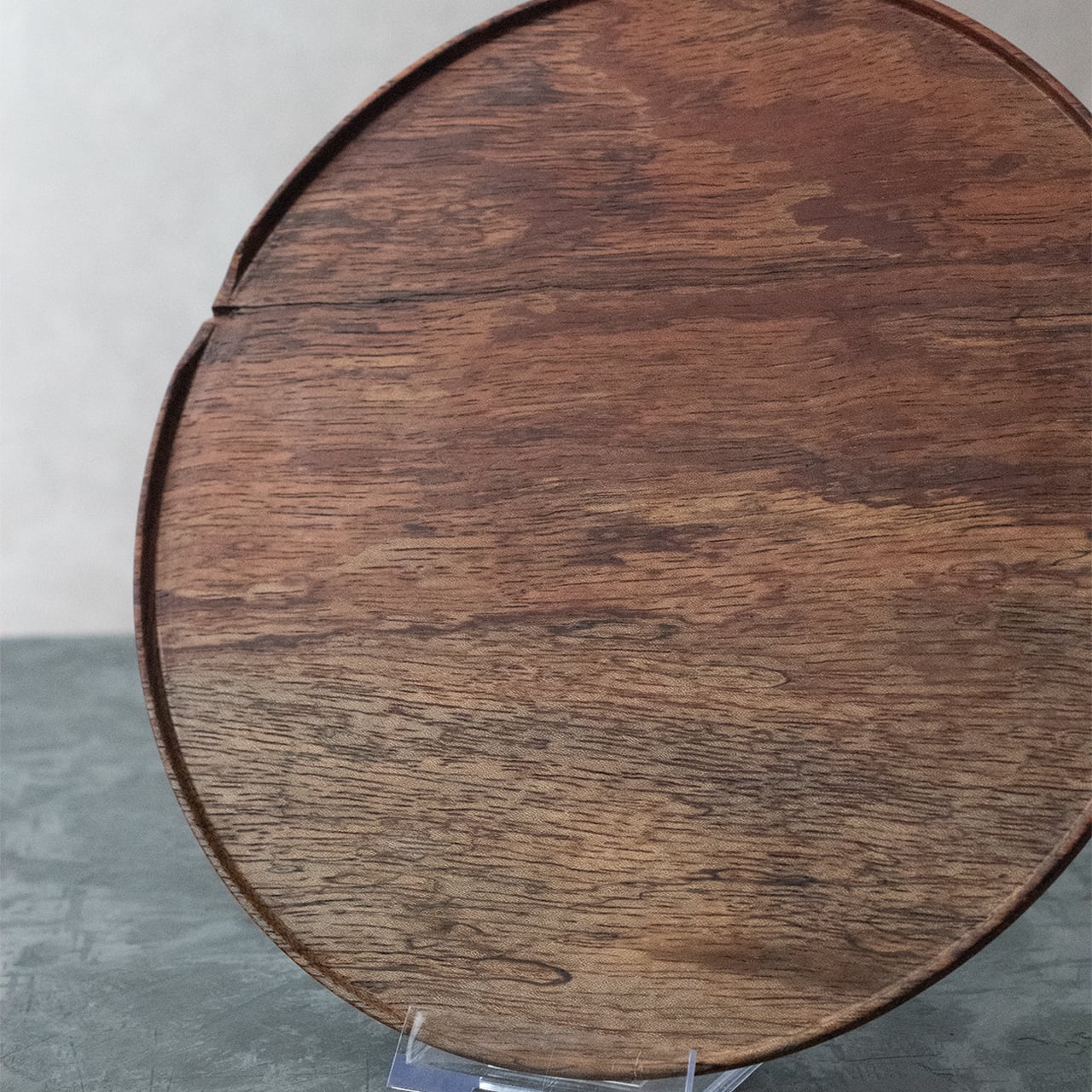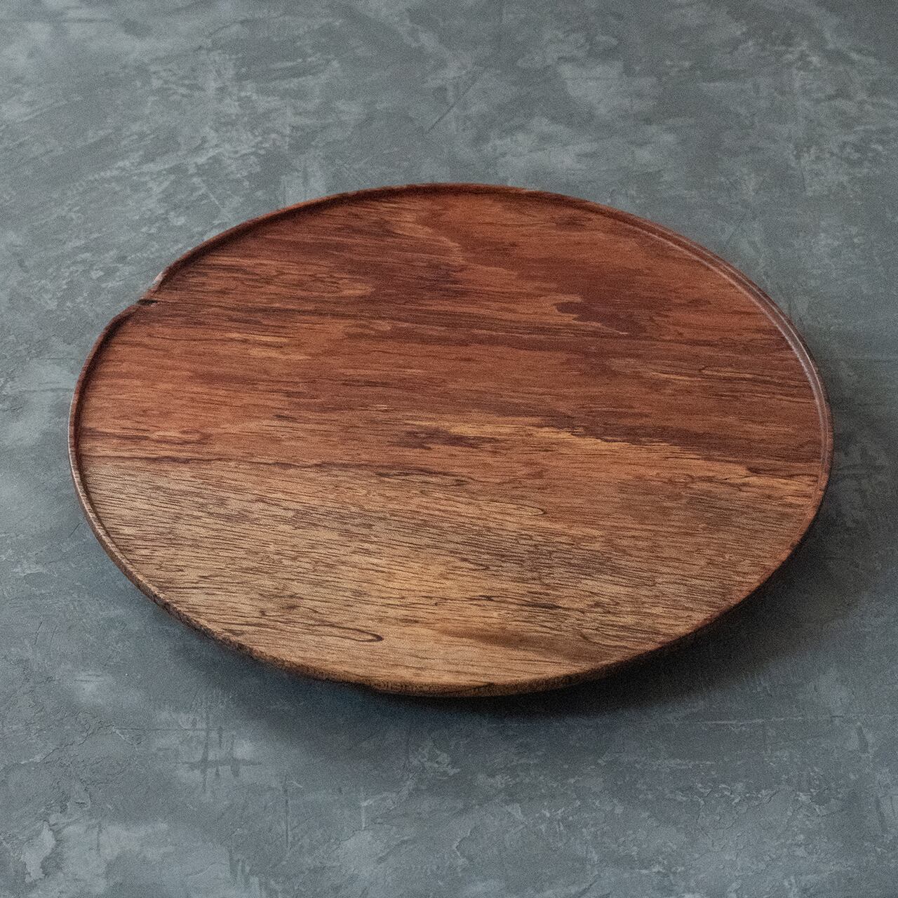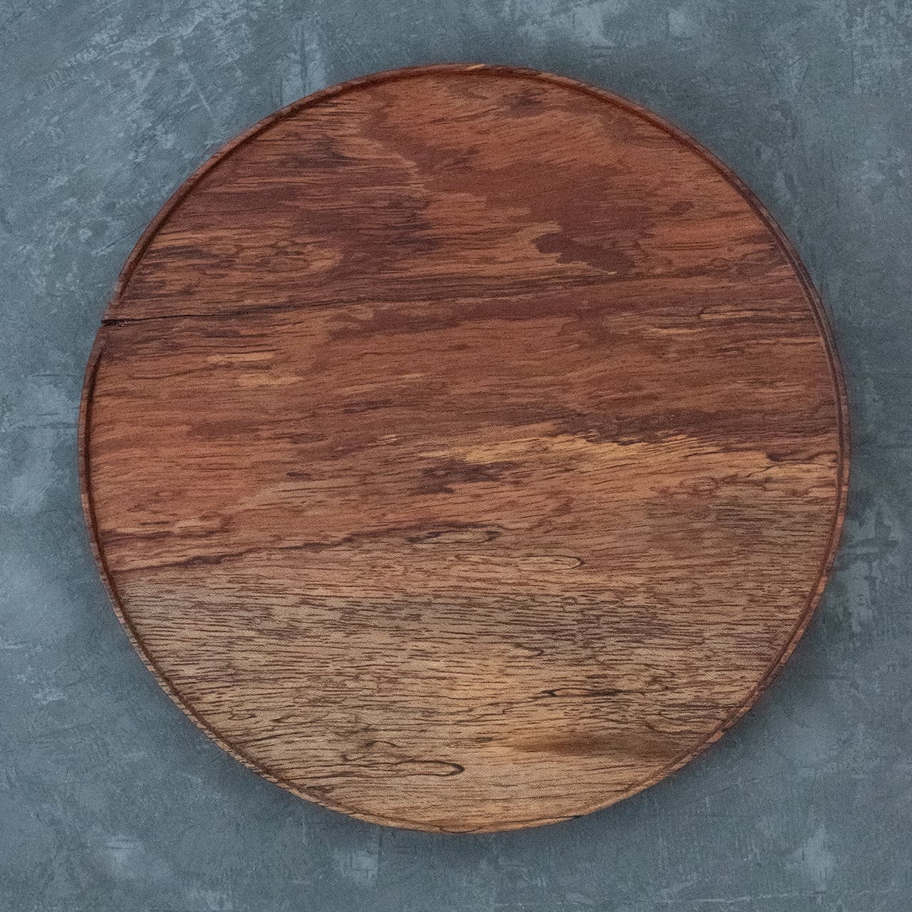 格別な存在感。なかなかお目にかかれない貴重な木を、重厚感たっぷりの約360g(缶ビール350ml位の重さ)のプレートに仕上げました。赤茶と白の珍しい2色使いに加え、所々に現れる黒い線。これはスポルテッドという木の珍しい特徴【杢(もく)】です。お皿としてだけでなく、ディスプレイとしてもおすすめ。